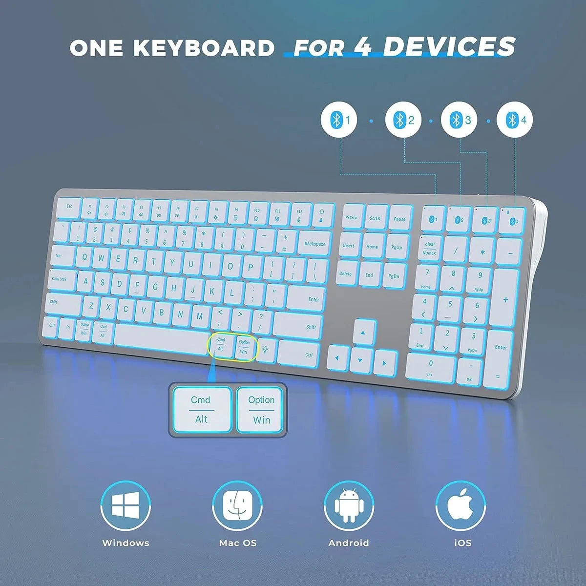 * 7 Colors Backlit Keyboard -- This wireless keyboard has 7 stylish backlight colors and 3 low-mid-high brightness levels, not only can experience different visual enjoyments, but also make it easy to use in dark places.